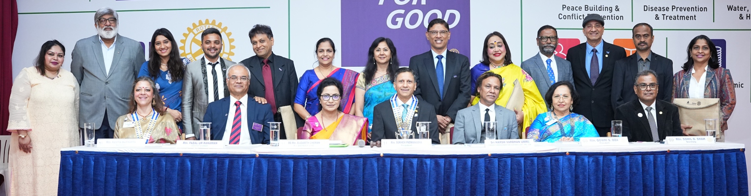 Secretary Rtn. Kavita Muthappa, Assistant Governor Rtn. Fazal Ur Rahaman, District Governor Rtn. Prof. Elizabeth Cherian, President Rtn. Sukhen Padmanabha, Chief Guest Shri. Harshavardhan Umre, Former Commissioner of Customs & GST, (IRS), GOI, Immediate Past President Rtn. Gowri S. Oza, Immediate Past Secretary Rtn. Sohil D. Shah