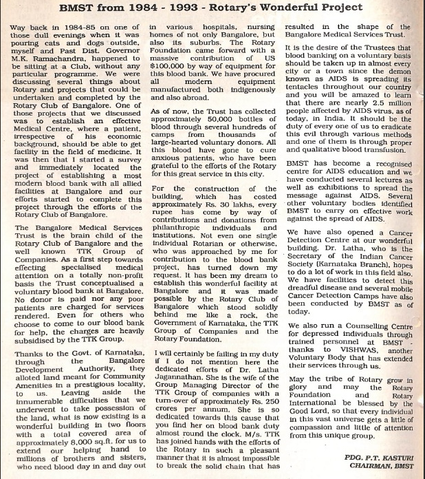Dr. Latha Jagannathan, Medical Director and Managing Trustee of Bangalore Medical Services Trust, provided valuable insights into the organisation’s inception, growth, and challenges. The voluntary blood donation movement began in 1983, spearheaded by Dr. Latha and her colleagues through blood donation camps. This initiative soon evolved when RCB leaders, including Rtn Capt Mani and PDG Rtn Kasturi, proposed establishing a blood bank in collaboration with Rotary and TTK & Co. Thus, BMST was founded in 1984 as a joint initiative.